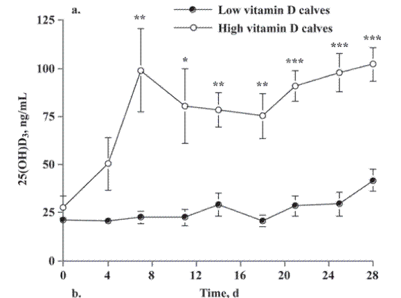 Calf with equiv 1930 IU daily 2009 Govt recommends 318 IU, vets give 2650 IU to 45Kg calf see wiki page with similar name, also see chart in this Gallery |